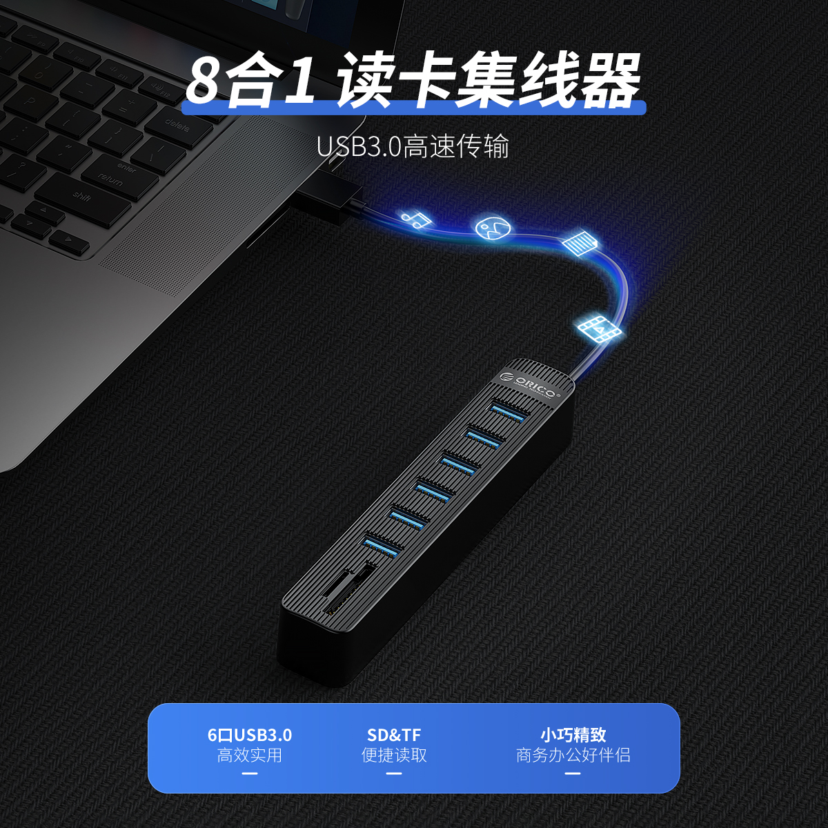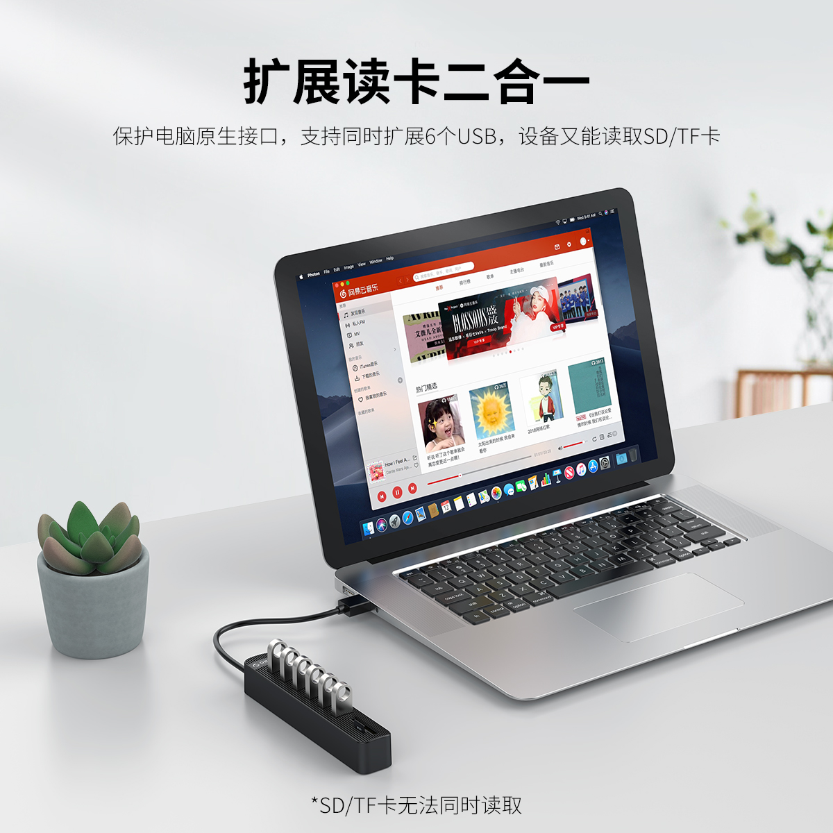 支持同時擴展6個USB,設備又能讀取SD/TF卡,5Gbps傳輸速率,支持2T大容量存儲卡、移動硬盤使用