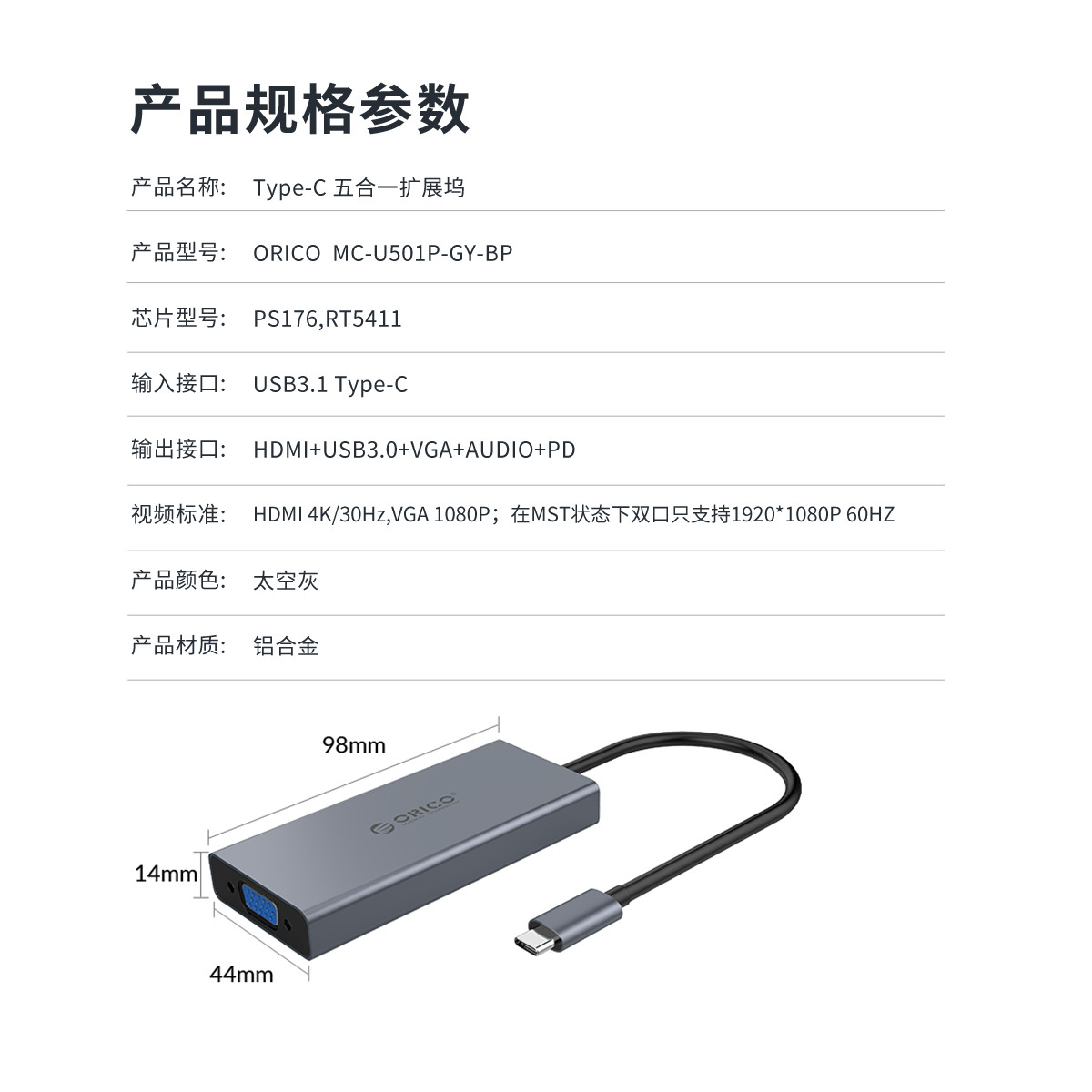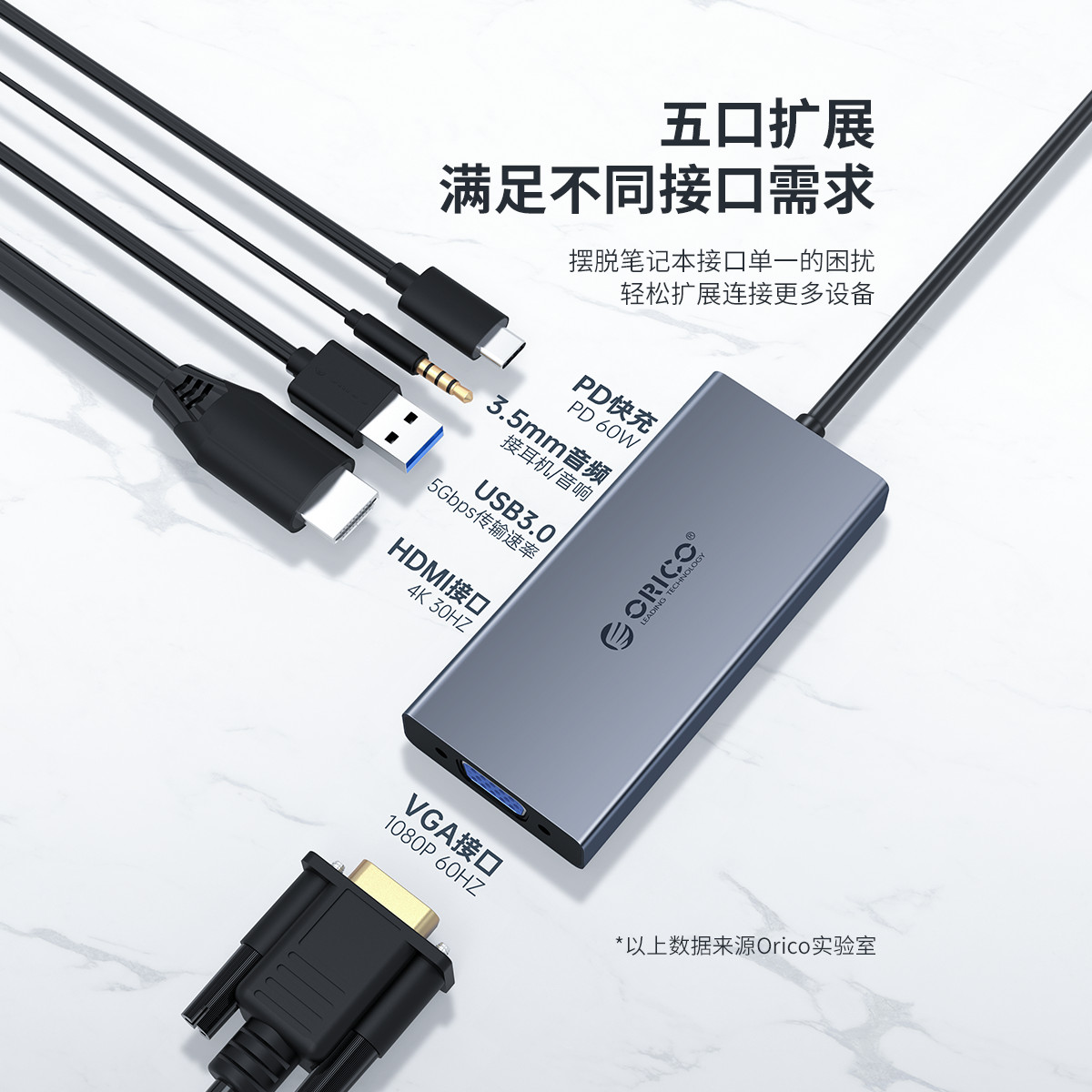 五口擴(kuò)展,USB Type-C口支持PD2.0,HDMI支持4K 30HZ視頻傳輸,HDMI+VGA雙視頻接口,標(biāo)準(zhǔn)的DC3.5MM音頻接口,內(nèi)置數(shù)字音頻編解碼器