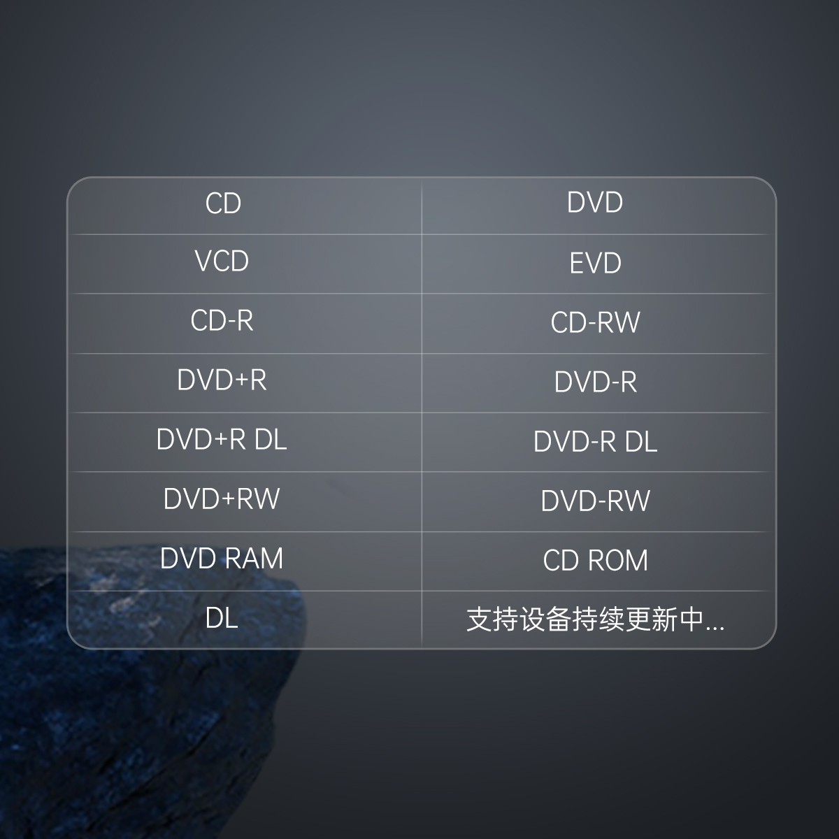DVD ROM (single layer),DVD ROM (dual layer),DVD+R/DVD-R,DVD+R DL/DVD-R DL,DVD+RW/DVD-RW,DVD RAM,CD ROM/ finalized CD RW,Data/CD-DAE,Video CD ,finalized CD RW.Unfinalized CD-R/RW