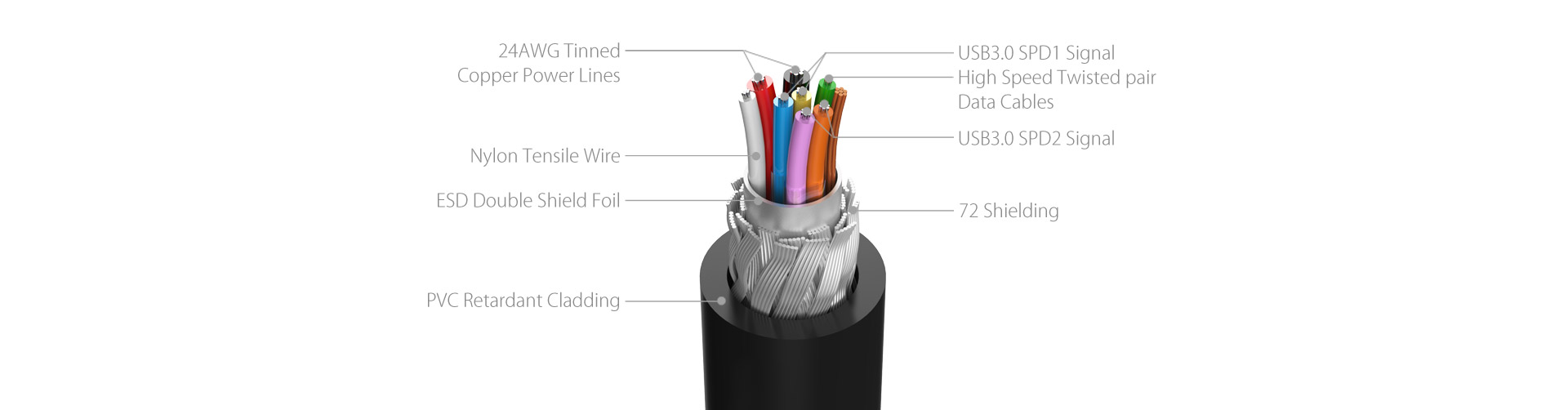 線材與傳輸性能,是選用HUB關鍵因素之一,ORICO選用線材均為選用線材的品質均經過嚴格測試更有保障!數據線采用高標準雙絞線,附鋁箔屏蔽層,確保優秀抗干擾性,7芯99.9%無氧銅芯線確保高速傳輸