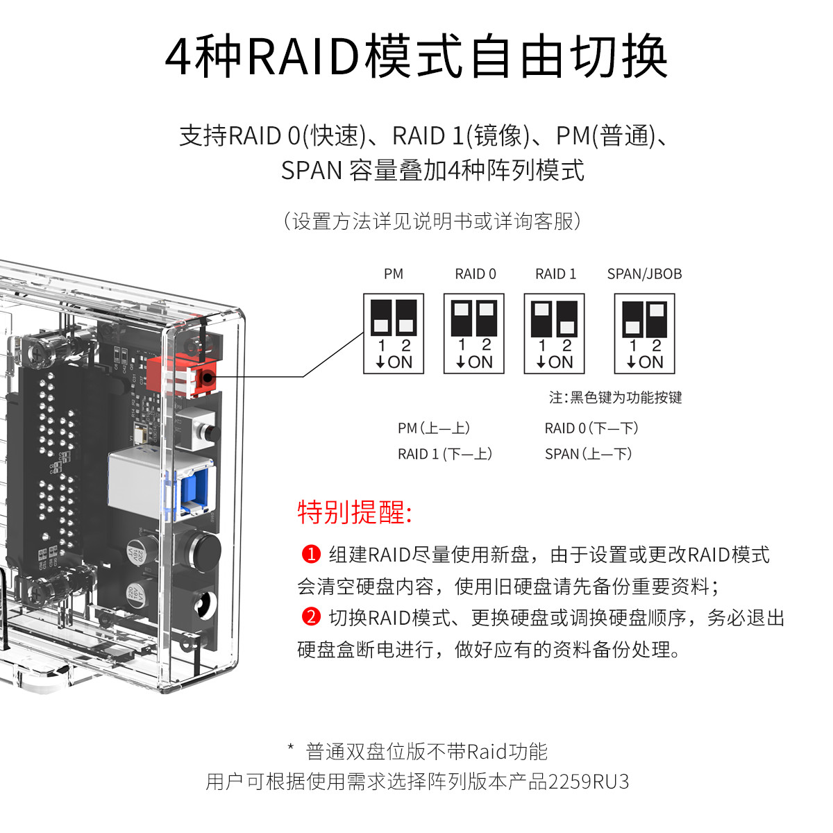 雙盤(pán)位磁盤(pán)陣列外置擴(kuò)容,1秒換盤(pán),雙盤(pán)4TB同時(shí)讀寫(xiě),4種模式自動(dòng)切換,智能休眠