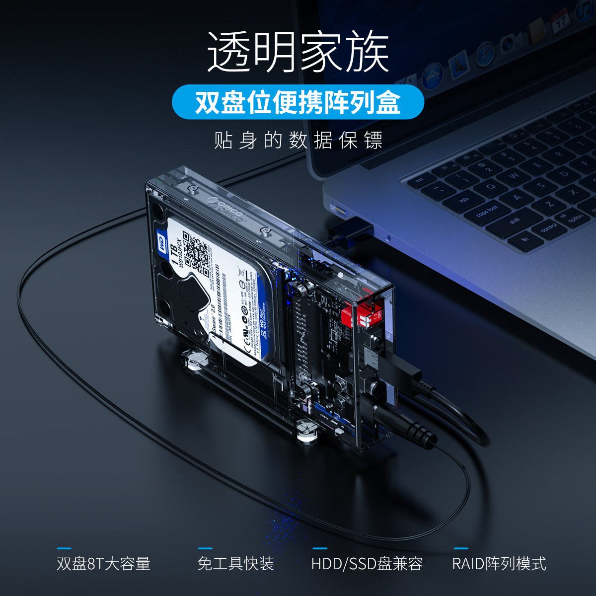 雙盤8T大容量,免工具快裝,HDD/SDD盤兼容,4種RAID模式,自由切換